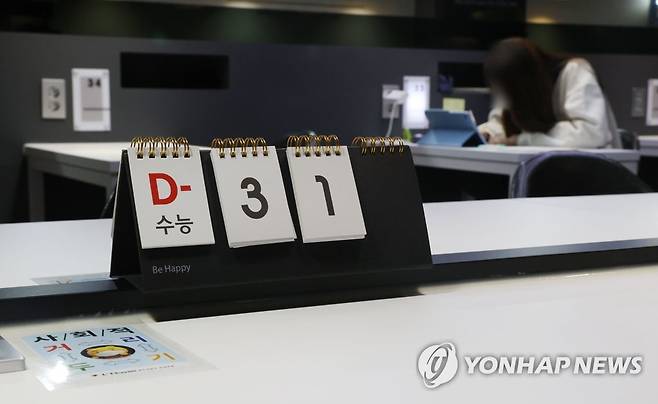 (서울=연합뉴스) 김인철 기자 = 2022학년도 대학수학능력시험을 31일 앞둔 18일 서울 양천구 르하임스터디카페 목동역점에 수능 디데이 달력이 놓여있다. 2021.10.18