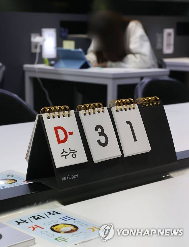(서울=연합뉴스) 김인철 기자 = 2022학년도 대학수학능력시험을 31일 앞둔 18일 서울 양천구 르하임스터디카페 목동역점에 수능 디데이 달력이 놓여있다. 2021.10.18