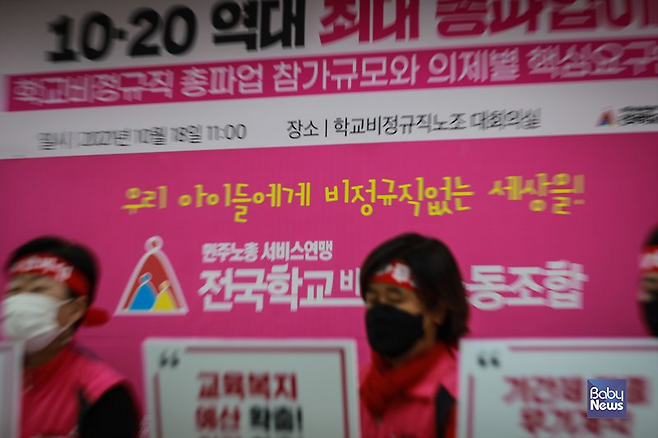 18일 전국학교비정규직노동조합원들이 서울 용산구 갈월동 회의실에서 '학교비정규직 총파업 참가규모와 의제별 핵심요구안 발표 기자간담회'를 가졌다.
