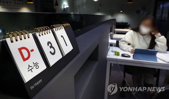 (서울=연합뉴스) 김인철 기자 = 2022학년도 대학수학능력시험을 31일 앞둔 18일 서울 양천구 르하임스터디카페 목동역점에 수능 디데이 달력이 놓여있다. 2021.10.18