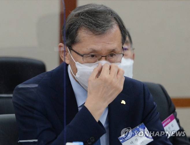 (대전=연합뉴스) 김준범 기자 = 18일 오전 대전 유성구 카이스트 대강당에서 열린 과학기술정보방송통신위원회의 정부출연 연구기관(출연연) 국정감사에서 이광복 한국연구재단 이사장이 마스크를 고쳐쓰고 있다. 2021.10.18 [공동취재]