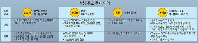 삼성 앞에 놓인 최대 과제는 '성장동력' 발굴이다. 반도체와 스마트폰, 가전에 이르는 현재 사업 포트폴리오를 넘어 미래를 주도할 기술과 제품을 발굴하는 것이 핵심이다. 현재 사업들이 중요하지만 갈수록 경쟁도 치열하다. 여기에 기술 발전으로 새로운 시장이 계속 열리고 있다. 신시장에서 주도권을 잡아야 미래를 담보할 수 있다. 삼성은 차세대 반도체, 인공지능(AI), 자동차 전장부품, 로봇, 바이오, 파운드리 등을 미래 성장동력 후보로 꼽고 육성에 집중하고 있다.