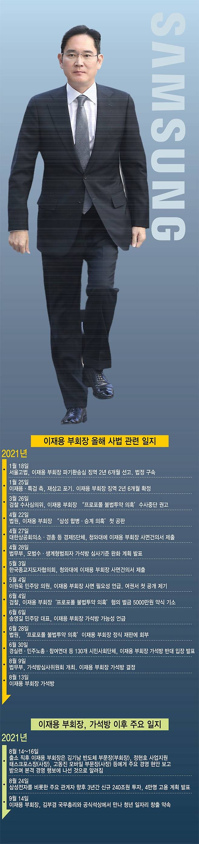 이 부회장은 올해 1월 국정농단 관련 재판에서 실형을 선고받고 다시 수감됐다. 이후 8월 13일에야 가석방됐다. 가석방 후 경영에 복귀했지만 취업제한 논란 등을 의식해 대외 활동을 자제해왔다.