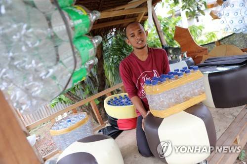 epa09529602 Zainuddin, a small local businessman, makes a sofa chair from used bottles in Banda Aceh, Indonesia, 18 October 2021. Zainuddin is a teacher who innovates using used bottles as materials for making chairs and sofas, a side business he started during the COVID-19 pandemic. He developed the idea of making a sofa using used bottle materials as a form of environmental preservation and improving the family's economic standing during the economic recession caused by the pandemic. EPA/HOTLI SIMANJUNTAK