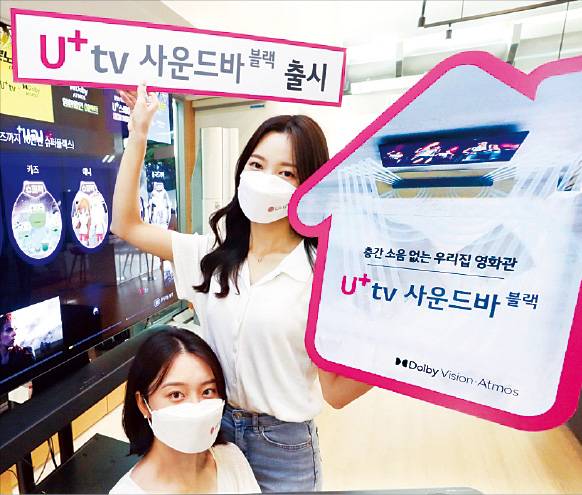 LG유플러스는 지난 8월 돌비 영상·음향 기술을 동시 적용한 셋톱박스 ‘U+tv 사운드바 블랙’을 내놨다. 장면마다 소리로 공간감을 느낄 수 있도록 했다. 영상 화면 중 시청자와 가까운 쪽에서 출입문을 여는 소리, 먼 곳에서 나는 자동차 경적 등을 구분해 들려준다. 오디오 전문 브랜드 JBL이 설계한 고출력 스피커 8개, 앰프 3개도 장착했다.