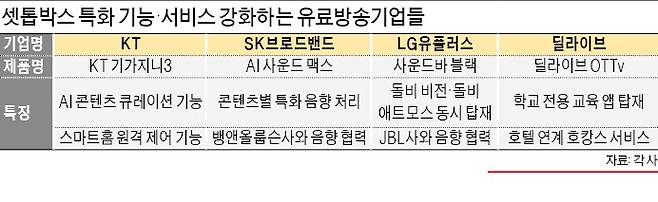 세계적인 음향 전문가가 소리 튜닝에 참여하고 출력 높은 우퍼 스피커를 달았다. 인공지능(AI) 기능도 적용했다. 고가의 홈시어터 장비 얘기가 아니다. 요즘 셋톱박스(방송 수신용 단말기)가 그렇다. 최근 유료방송 업계에선 셋톱박스를 음향·AI 기기나 플랫폼 기기로 활용하려는 움직임이 뚜렷하다. 인터넷TV(IPTV), 케이블TV를 보기 위한 필수 장비인 셋톱박스에 각종 특화 기능을 더하면 사용자들을 장기간 묶어두는 록인효과(자물쇠 효과)를 낼 수 있어서다.