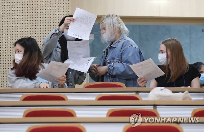(서울=연합뉴스) 임헌정 기자 = 18일 서울 동작구 흑석동 중앙대학교에 마련된 '찾아가는 코로나19 백신 접종 센터'에서 외국인 유학생들이 화이자 백신 접종 절차를 안내받고 있다. 2021.10.18