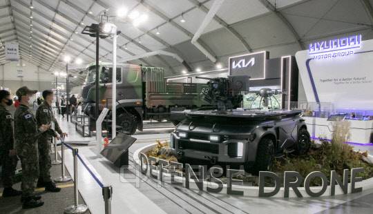 18일 경기도 성남 서울공항에서 열린 서울 국제항공우주 및 방위산업 전시회 2021'(서울 ADEX) 프레스데이 행사에서 방문객이 현대로템 부스를 둘러보고 있다.