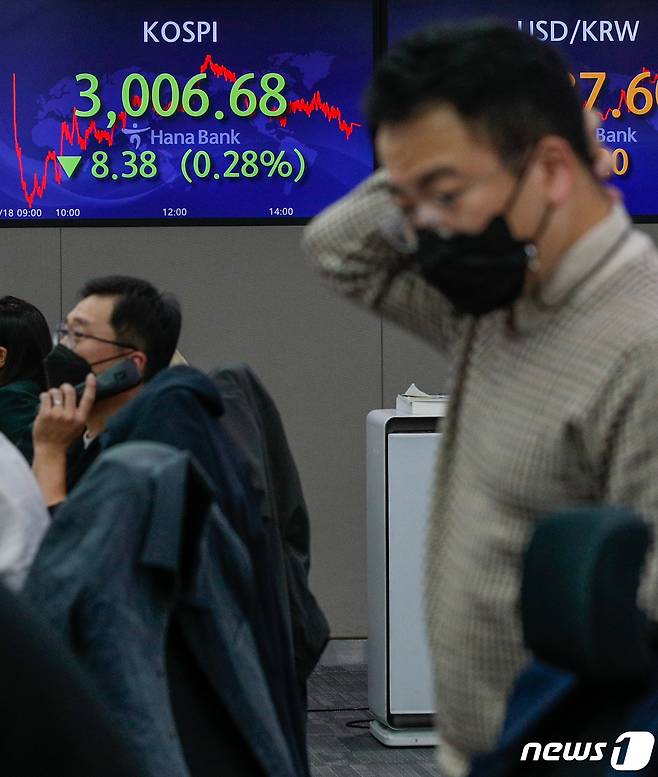 (서울=뉴스1) 안은나 기자 = 18일 오후 서울 중구 하나은행 딜링룸에 코스피지수가 전 거래일보다 8.38포인트(0.28%) 내린 3006.68을 나타내고 있다. 코스피는 장중 한때 기관의 매도세로 인해 3000선을 내주기도 했다. 2021.10.18/뉴스1