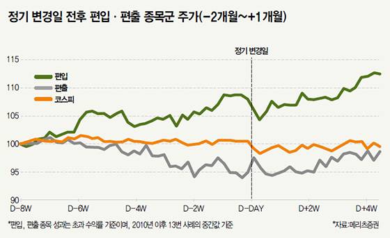 물론 정기 변경 종목을 선매수하는 전략에도 약점은 있다. 남은 기간 동안 주가 변동에 따라 편입 예상 종목이 바뀔 수 있다는 점은 주의해야 한다. 반대로 편출 예상 종목을 미리 매도하는 전략은 효과를 확신하기 어렵다. 제외 종목의 경우 이미 주가 부진으로 지수 내에서 차지하는 비중이 낮아 수급 영향이 제한적이기 때문이다.
