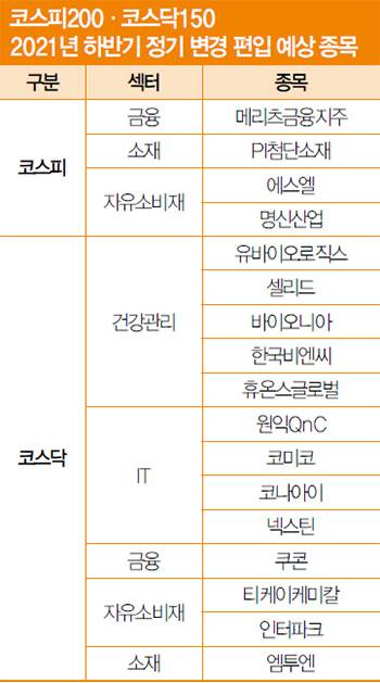 증권가는 이번 정기 변경에 신규 편입 가능성이 높은 종목으로 메리츠금융지주, PI첨단소재, 에스엘, 명신산업을 꼽는다. 변수는 ‘IPO 대어’ 현대중공업과 카카오페이의 특례 편입이다. 현대중공업은 지난 9월 17일 상장했고 카카오페이는 11월 3일 상장 예정이다. 신규 상장 종목 시가총액이 상장일부터 15거래일간 코스피 상위 50위 이내일 경우 코스피200에 특례 편입될 수 있다.