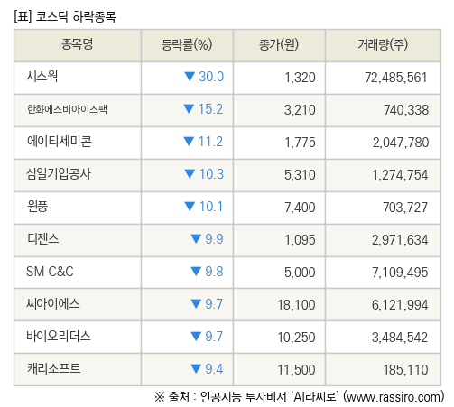 [fnRASSI]장마감, 코스닥 하락 종목(시스웍 -30.0% ↓)