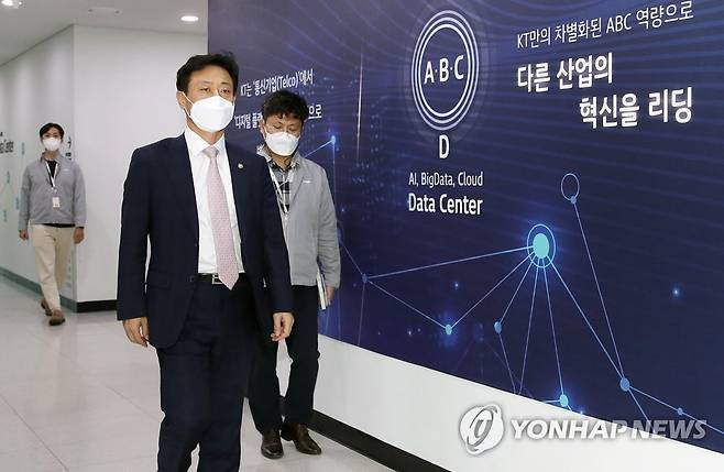 (서울=연합뉴스) 박기영 산업통상자원부 2차관이 18일 오후 서울 양천구 목동에 위치한 KT 데이터센터를 방문해 주요 시설을 둘러보고 있다. 2021.10.18