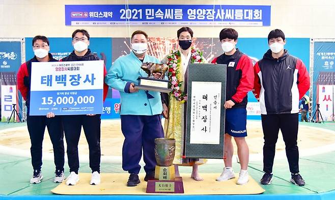 [서울=뉴시스] 18일 경북 영양군 영양국민체육센터에서 열린 위더스제약 2021 영양장사씨름대회 태백장사(80kg이하)에 등극한 이재안(양평군청)이 신택상 감독 및 팀원들과 기념촬영을 하고 있다. (사진=대한씨름협회 제공) 2021.10.18. photo@newsis.com *재판매 및 DB 금지
