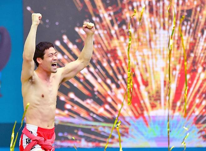 [서울=뉴시스] 18일 경북 영양군 영양국민체육센터에서 열린 위더스제약 2021 영양장사씨름대회 태백장사(80kg이하)에 등극한 이재안(양평군청)이 우승 확정 후 기뻐하고 있다. (사진=대한씨름협회 제공) 2021.10.18. photo@newsis.com *재판매 및 DB 금지