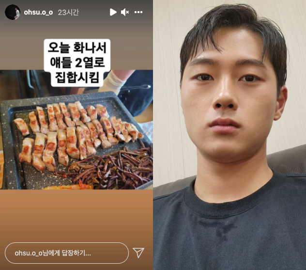 오상욱은 17일 자신의 인스타그램 스토리에 “오늘 화나서 얘들 2열로 집합 시킴”이라는 메시지를 남겼다. 팬들은 깜짝 놀랐지만 다행히 그가 집합 시킨 건 삼겹살과 고사리, 김치였다.
