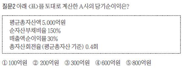 ▶ 정답 및 해설 : 당기순이익을 산출하기 위해서는 총자산회전율 계산식을 이용해 매출액을 계산한 뒤 매출액순이익률 계산식에 대입하면 된다. 총자산회전율은 매출액을 평균총자산으로 나눈 값이다. 표에 있는 숫자를 대입하면 0.4 = 매출액/5000억원이다. 이 식을 통해 매출액은 2000억원이라는 것을 알 수 있다. 이 값을 매출액순이익률(당기순이익/매출액) 계산식에 대입하면 0.3 = 당기순이익/2000억원이다. 따라서 당기순이익은 600억원이다. 정답 ④