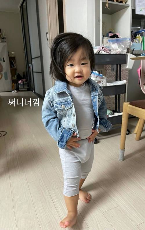 공개된 사진 속 이윤지의 둘째 딸 소울 양은 내복에 청재킷을 걸친 깜찍한 패션을 선보이고 있다.