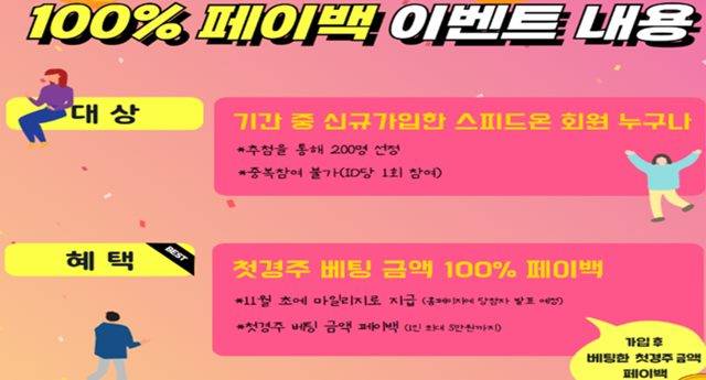 [더팩트 | 박순규 기자] 국민체육진흥공단(이사장 조현재) 경주사업총괄본부는 오는 21일까지 경륜경정 온라인 발매(Speed-On) 회원으로 신규 가입한 고객을 대상으로 100% 페이백 이벤트를 시행한다고 밝혔다.