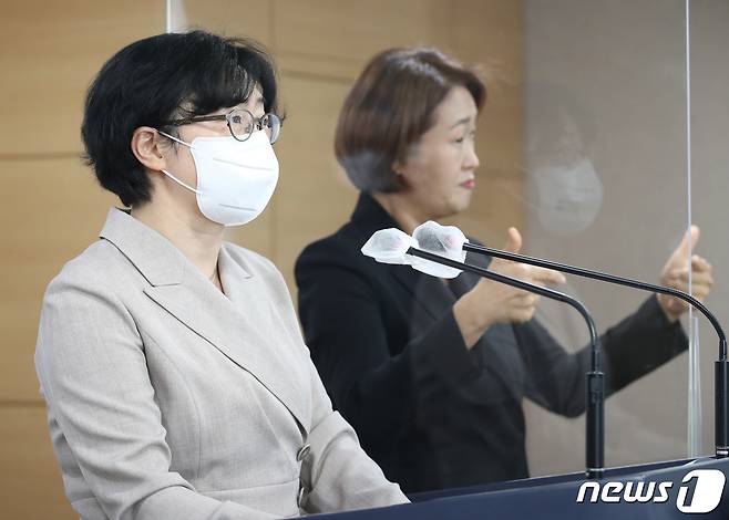 윤순진 2050 탄소중립위원회 민간위원장이 18일 오후 서울 종로구 정부서울청사에서 2030 국가 온실가스감축목표(NDC) 관련 탄소중립위 전체회의 브리핑을 하고 있다.