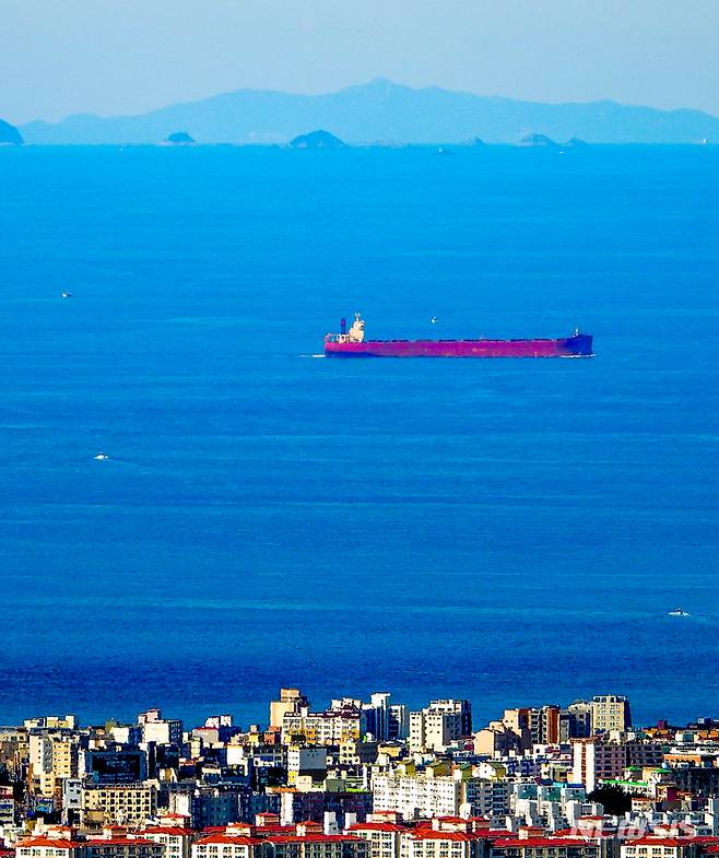 [제주=뉴시스] 우장호 기자 = 맑은 날씨를 보인 18일 오후 제주시 아라동 인근 전망대에서 약 100㎞ 이상 멀리 떨어진 전라남도 진도군 여귀산(사진 윗부분 가운데·높이 458.4m)이 보인다. 2021.10.18. woo1223@newsis.com