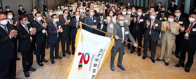 재외동포경제단체가 주최하고, 재외동포재단과 매일경제·MBN이 주관하는 제19차 세계한상대회가 서울 잠실 롯데호텔월드에서 19일 개막한다. 이번 대회는 '기후변화 대응을 위한 4차 산업혁명과 그린뉴딜'이라는 주제로 21일까지 3일간 열린다. 개막 하루 전인 18일 장대환 매경미디어그룹 회장 주최 만찬이 잠실 시그니엘 서울 호텔에서 열렸다. 만찬에 앞서 하경서 세계한상대회 공동대회장이 한상기를 흔들며 성공적인 개최를 기원하고 있다. 앞줄 왼쪽 다섯째부터 김우재 무궁화유통 회장, 이영현 영리무역 회장, 장 회장, 조병대 소네트그룹 회장, 이숙진 제마이홀딩스 회장, 정영수 CJ그룹 글로벌경영고문, 하용화 세계한인무역협회 회장.