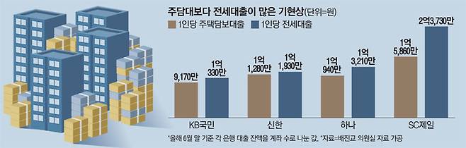 18일 배진교 정의당 의원실이 금융감독원에서 받은 자료를 매일경제가 재가공해 분석한 결과에 따르면 7개 시중은행(KB국민·신한·하나·우리·SC제일·씨티·기업) 중 4개 은행(KB국민·신한·하나·SC제일)에서 1인당 전세대출액이 1인당 주택담보대출액보다 커지는 현상이 발생했다.