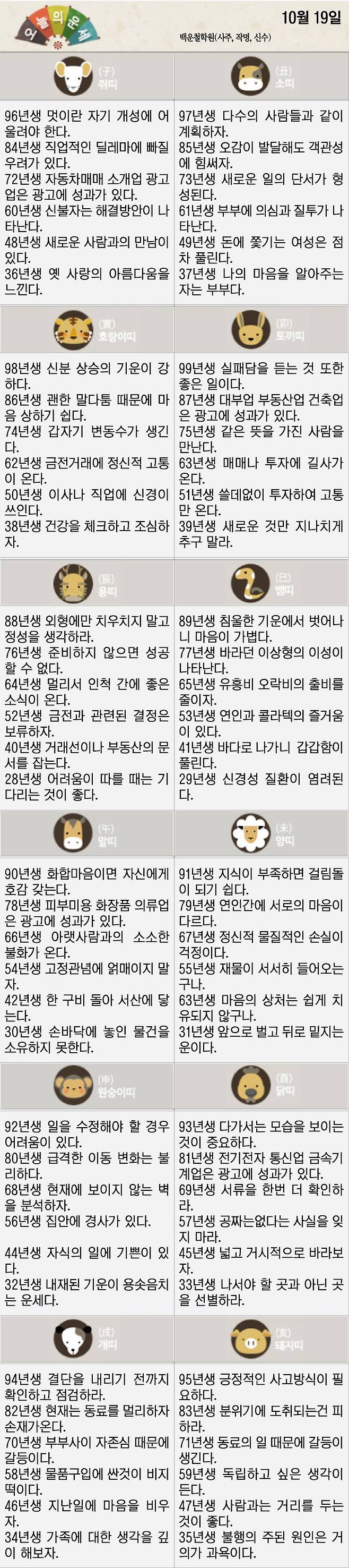 [재미로 보는 오늘의 운세] 10월 19일 (화요일)