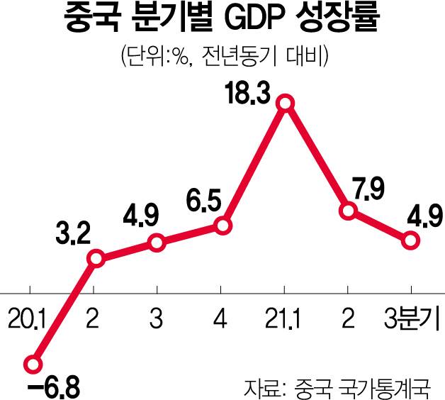 중국의 지난 3분기 국내총생산(GDP) 증가율이 4%대로 떨어졌다. 중국 전국을 휩쓴 전력 대란과 부동산 침체 등의 복합 악재에 충격을 받은 결과다. 이들 악재가 당분간 심화될 것으로 보여 4분기 전망도 불투명하다. 올해 8% 성장 전망은 물 건너갔다는 분석마저 나오고 있다.