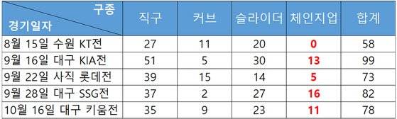 지난달 28일 대구 SSG전에선 체인지업 비율이 전체 투구 수 대비 19.5%까지 올랐다. 직전 등판인 지난 16일 대구 키움전(더블헤더 2차전)에서도 14.1%로 두 자릿수를 넘겼다. 키움전 5이닝 2실점 쾌투 비결 중 하나가 체인지업이었다. 허삼영 삼성 감독은 "구종(체인지업)을 하나 더 추가한 거로 이닝을 소화했다. 키움도 처음 상대하는 투수이니 3회까지는 구종 파악이 덜 된 것 같다"고 말했다.