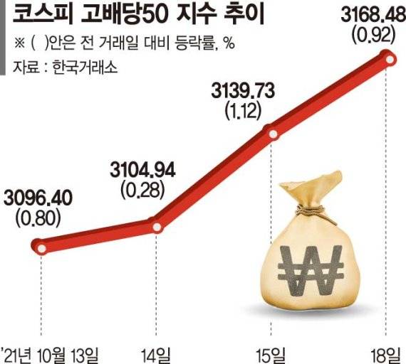 18일 한국거래소에 따르면 이날 코스피 고배당50 지수는 전 거래일 대비 28.75(0.92%) 오른 3168.48을 기록했다. 코스피 고배당50 지수는 지난 13일부터 4거래일 연속 상승세를 보이며 이기간 동안 3.12% 상승했다. 코스피 고배당50지수는 올해 36%, 최근 6개월간 11% 상승했다.