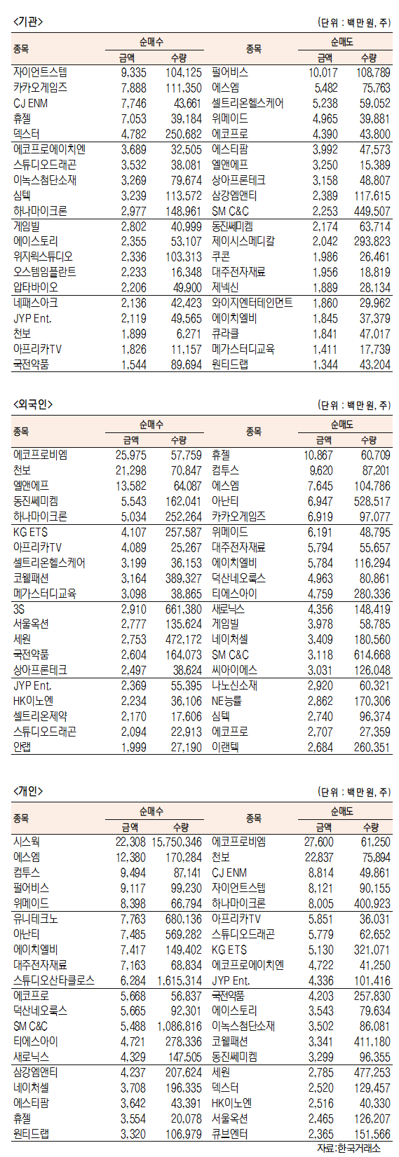 [표]코스닥 기관·외국인·개인 순매수·도 상위종목(10월 18일-최종치)