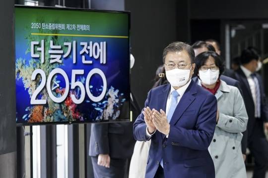 문 대통령은 18일 오후 서울 용산구 노들섬에서 열린 ‘2050 탄소중립위원회 제2차 전체회의’를 주재하며 "역사적인 발표를 했다. 탄소중립 선언 1년 만에 시나리오, NDC 상향목표를 결정한 건데, 과제의 어려움을 생각하면 짧은 기간 동안 속도 있게 목표를 만들어냈다"고 격려하면서 이같이 전했다.