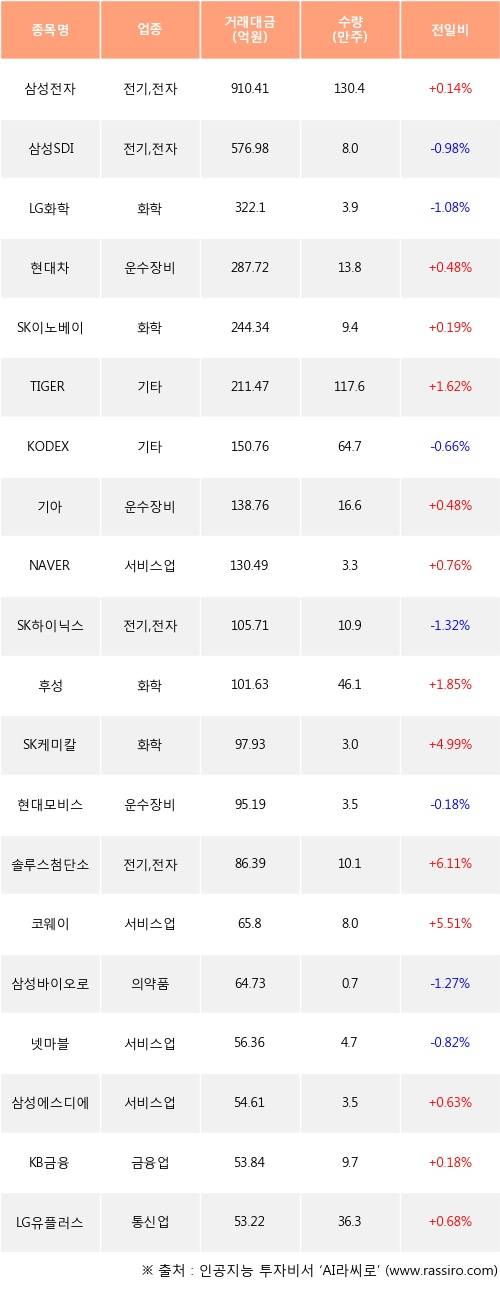 삼성전자, 현대차, SK이노베이션 등은 전일 대비 주가가 상승했고, 삼성SDI, LG화학, KODEX 레버리지 등은 주가가 하락했다.