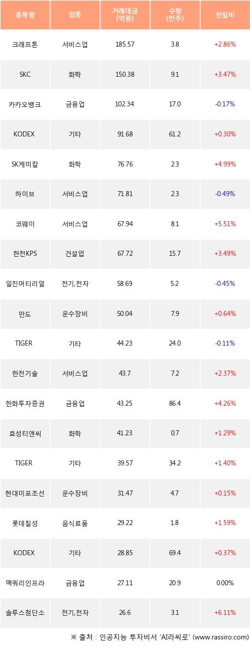 18일, 기관 거래소에서 크래프톤(+2.86%), SKC(+3.47%) 등 순매수
