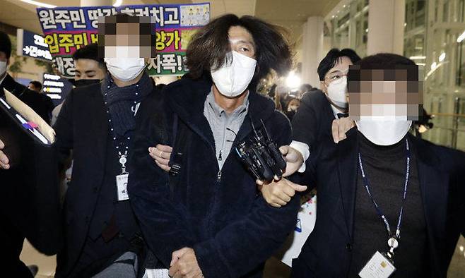 | 검찰로 압송 ‘대장동 특혜 개발 의혹’의 핵심인물인 남욱 변호사(가운데)가 18일 인천국제공항 2터미널에 도착한 후 검찰에 체포돼 서울중앙지검으로 압송되고 있다. ‘천화동인 4호’ 소유주인 남 변호사는 검찰 수사 전 미국으로 출국했다가 한 달 만에 귀국했다. 인천공항=뉴시스 |