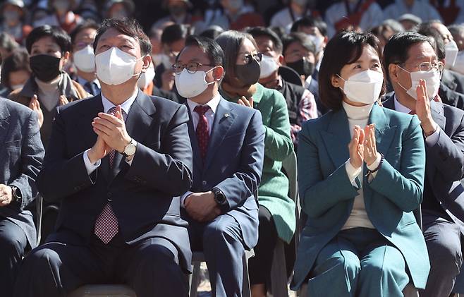 | 박수치는 尹 국민의힘 윤석열 대선 경선 후보(왼쪽)와 더불어민주당 이재명 대선 후보의 배우자 김혜경씨가 18일 경남 양산 통도사에서 열린 행사에 참석해 박수치고 있다. 양산=뉴스1 |