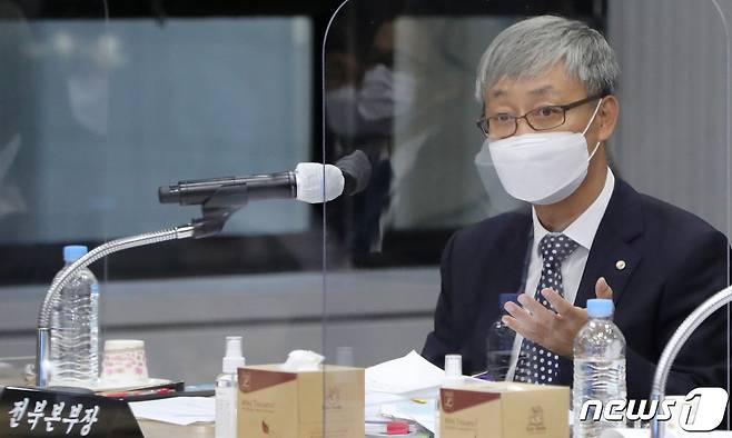 (전주=뉴스1) 유경석 기자 = 한경수 한국은행 전북본부장이 18일 전북 전주시 한국은행 전북본부에서 열린 2021년도 기획재정위원회의 한국은행 전북본부, 대전·충남본부, 충북본부, 대전지방국세청 국정감사에서 질의에 답변을 하고 있다. 2021.10.18/뉴스1