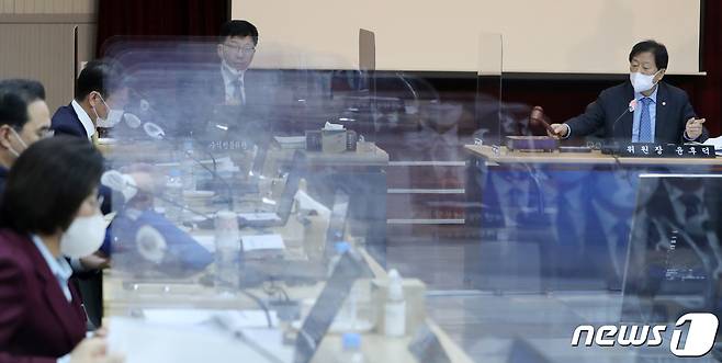 (전주=뉴스1) 유경석 기자 = 윤후덕 위원장이 18일 전북 전주시 한국은행 전북본부에서 열린 2021년도 기획재정위원회의 한국은행 전북본부, 대전·충남본부, 충북본부, 대전지방국세청 국정감사 종료를 알리며 의사봉을 치고 있다. 2021.10.18/뉴스1