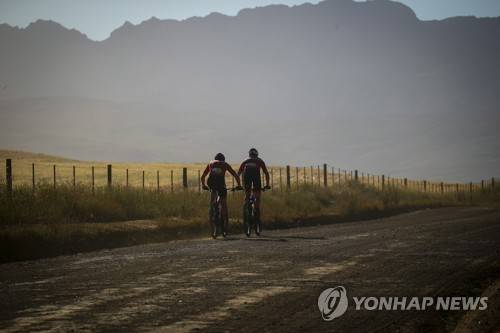 epa09529786 A team of two riders race during Stage 1 of the 2021 Absa Cape Epic mountain bike stage race over 98km in and around the town of Ceres, South Africa, 18 October 2021. This year's event sees 600 riders tackle 620 kilometres over 8 days of riding and 15,350 metres of vertical ascent. The race includes UCI pro riders and amateur's in what is seen by many as the premier MTB stage race in the world. EPA/KIM LUDBROOK