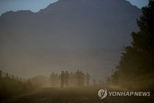 epa09529787 The professional elite riders race in a peloton on a dirt road during Stage 1 of the 2021 Absa Cape Epic mountain bike stage race over 98km in and around the town of Ceres, South Africa, 18 October 2021. This year's event sees 600 riders tackle 620 kilometres over 8 days of riding and 15,350 metres of vertical ascent. The race includes UCI pro riders and amateur's in what is seen by many as the premier MTB stage race in the world. EPA/KIM LUDBROOK