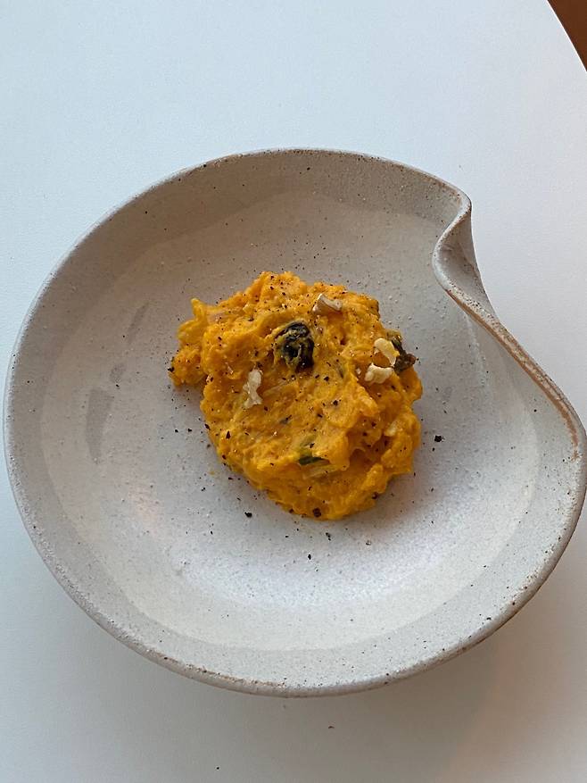 5. 베이컨 기름이 남은 팬에 2의 단호박 퓌레와 파스타면수 약간을 넣어 재빨리 볶는다. 이때 세이지나 타임 등의 허브를 더해도 좋다.