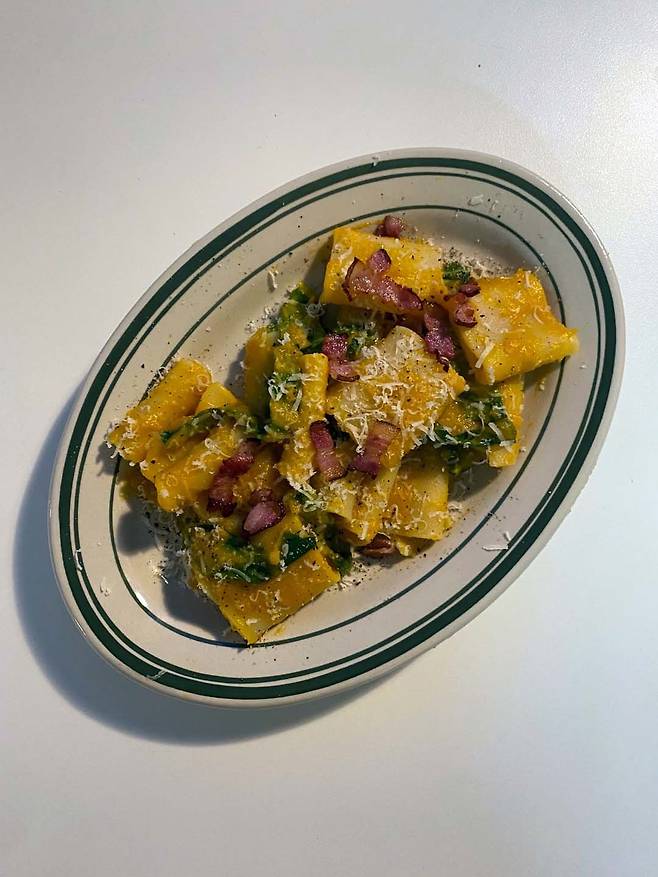 위의 삶은 단호박 2/3 분량, 파스타면 2인분, 두꺼운 베이컨 2줄, 케일이나 시금치 약간, 고형 치킨스톡 작은 것 1개, 파르미지아노 레지아노 치즈 갈은 것 1컵, 마스카포네 2큰술(생략 가능), 소금·후추 적당량