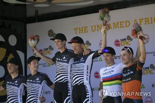 epa09529825 Stage winners Bulls #1 team riders Urs Huber (C-R) of Switzerland and Simon Schneller (C-L) of Germany celebrate on the podium after Stage 1 of the 2021 Absa Cape Epic mountain bike race over 98km in and around the town of Ceres, South Africa, 18 October 2021. This years event sees 600 riders tackle 620km over eight days of riding and 15,350m of vertical ascent. The race includes UCI pro riders and amateurs in what is seen by many as the premier MTB stage race in the world. EPA/KIM LUDBROOK