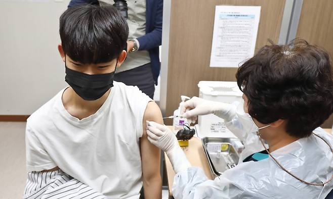| “긴장돼요” 16~17세 청소년 코로나19 백신 접종 첫날인 18일 서울 양천구 홍익병원에서 한 청소년이 백신을 맞고 있다. 사진공동취재단 |