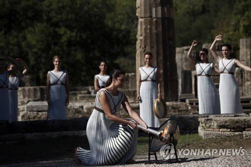 epa09529839 Greek actress Xanthi Georgiou, playing the role of High Priestess, lights the flame during the Olympic flame lighting ceremony for the Beijing 2022 Winter Olympics, at the Ancient Olympia site in Peloponnese, southern Greece, 18 October 2021. The four Tibetan activists, one man and three women were detained by police in ancient Olympia. EPA/YANNIS KOLESIDIS