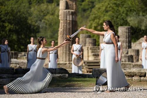 epa09529880 Greek actress Xanthi Georgiou (R), playing the role of High Priestess, holds the torch during the Olympic flame lighting ceremony for the Beijing 2022 Winter Olympics, at the Ancient Olympia site in Peloponnese, southern Greece, 18 October 2021. EPA/POOL/Thanassis Stavrakis POOL