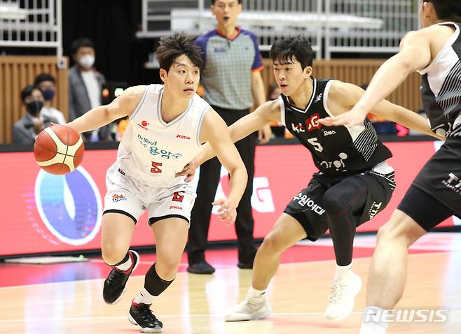 [수원=뉴시스] 정병혁 기자 = 18일 오후 경기 수원시 서수원칠보체육관에서 열린 2021-2022 KGC인삼공사 정관장 프로농구 수원 KT 소닉붐과 고양 오리온 오리온스의 경기, 오리온 한호빈이 드리블하고 있다. 2021.10.18. jhope@newsis.com
