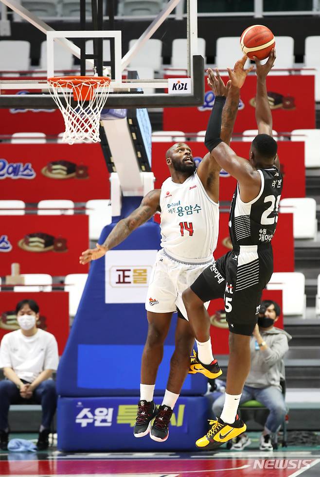 [수원=뉴시스] 정병혁 기자 = 18일 오후 경기 수원시 서수원칠보체육관에서 열린 2021-2022 KGC인삼공사 정관장 프로농구 수원 KT 소닉붐과 고양 오리온 오리온스의 경기, KT 라렌이 슛을 하고 있다. 2021.10.18. jhope@newsis.com