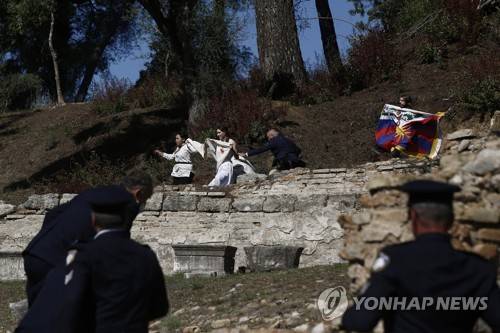 epa09529887 Policemen chase tibetan activists holding a tibetan flag after they invaded the Olympic flame lighting ceremony for the Beijing 2022 Winter Olympics, at the Ancient Olympia site in Peloponnese, southern Greece, 18 October 2021. The four Tibetan activists, one man and three women were detained by police in ancient Olympia. EPA/YANNIS KOLESIDIS